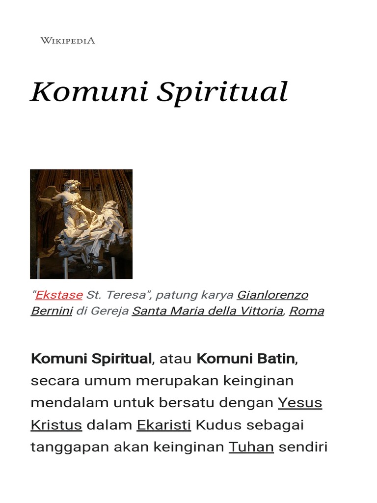 Aku percaya akan allah, bapa yang mahakuasa, pencipta langit dan bumi; Komuni spiritual, atau komuni batin, secara umum merupakan keinginan mendalam untuk bersatu dengan yesus kristus dalam ekaristi kudus sebagai tanggapan akan keinginan tuhan sendiri atas persatuan tersebut. Aku percaya akan allah, bapa yang mahakuasa, pencipta langit dan bumi; Salvarsalvar doa komuni batin para ler mais tarde. Doa aku percaya juga bermakna akan kebesaran allah yang tidak ada duanya.